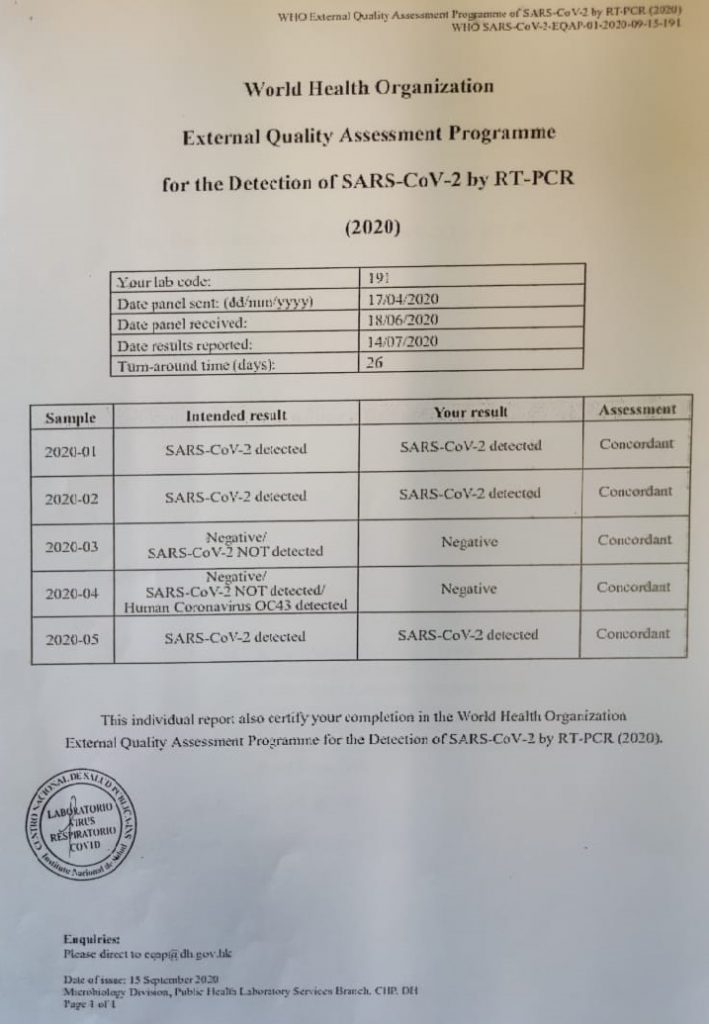 El Laboratorio de Referencia Nacional de Virus Respiratorio del Centro Nacional de Salud Pública recibió el certificado luego de analizar un panel con 5 muestras, cuyos resultados fueron concordantes a las muestras entregadas por la organización internacional, cumpliendo así con los lineamientos estandarizados y descritos en el MET-CNSP-195: RT-PCR Multiplex en Tiempo Real para la Detección del Virus SARS-CoV-2.
